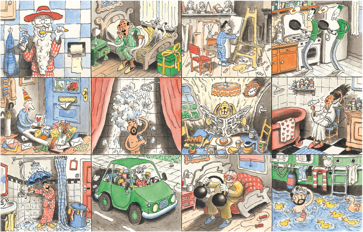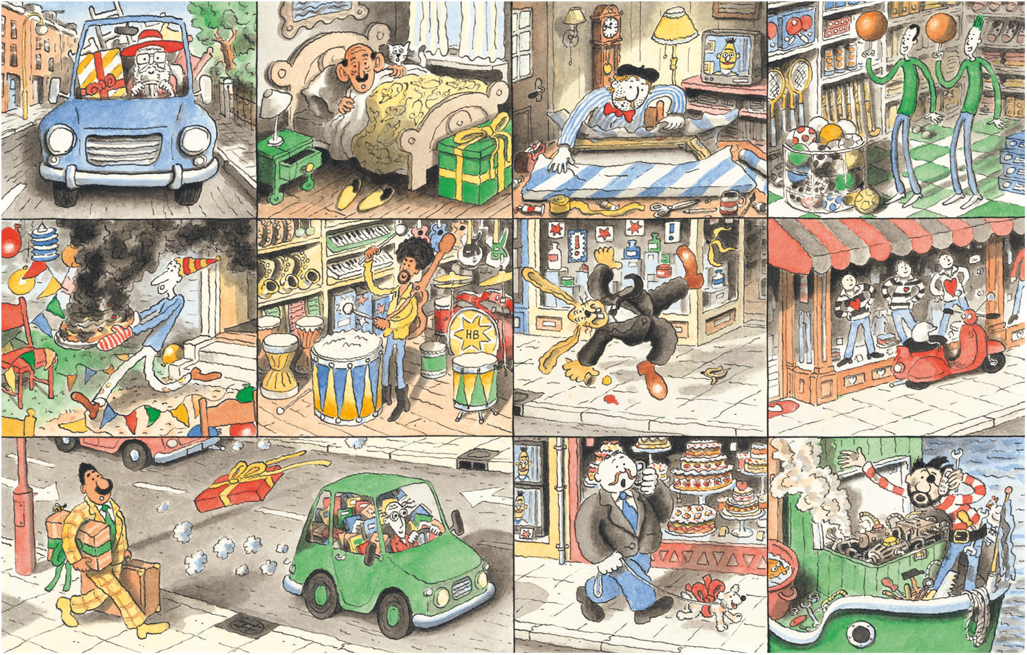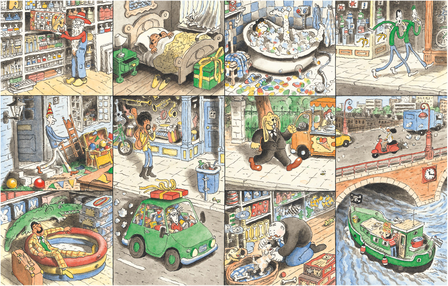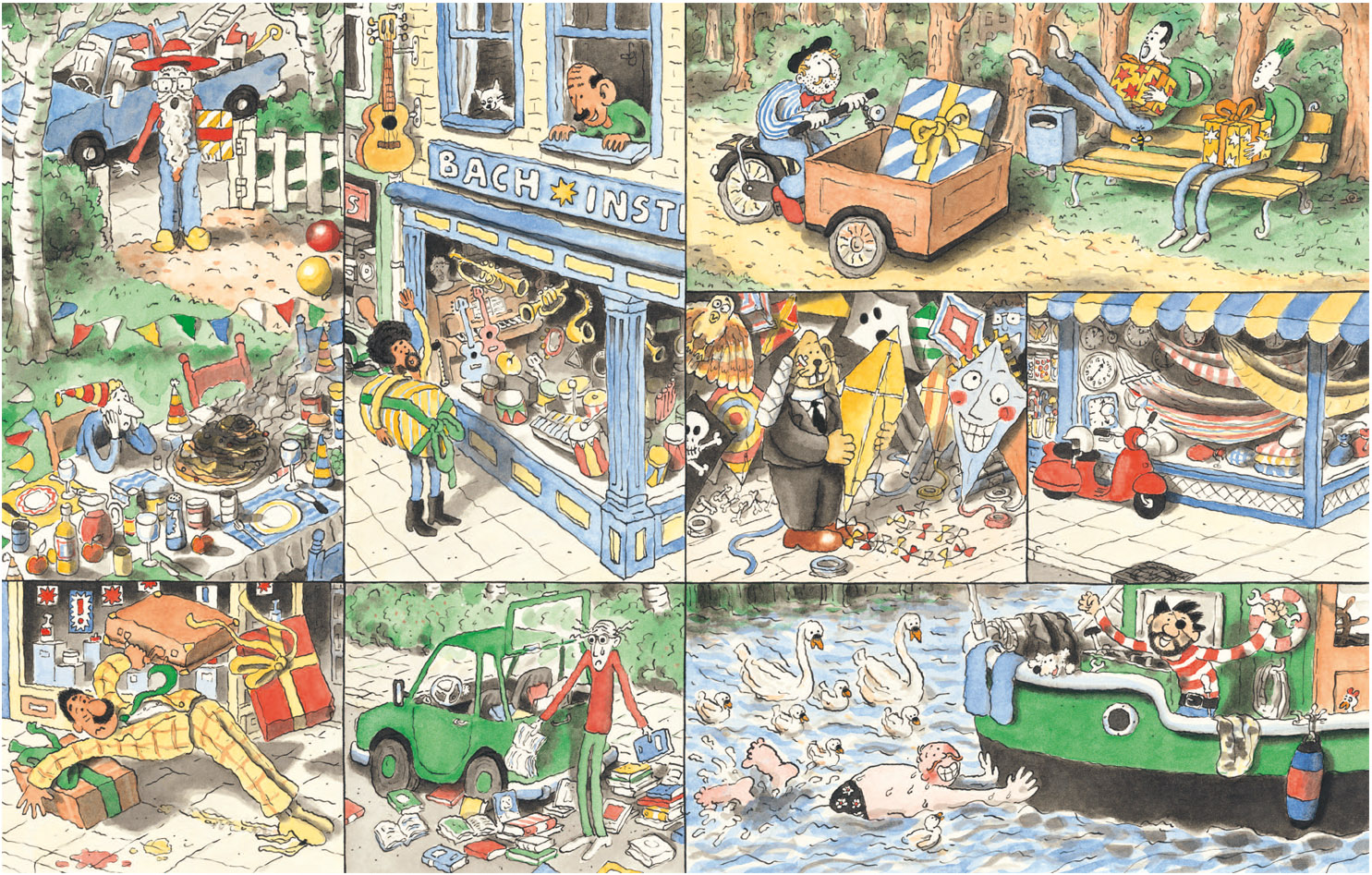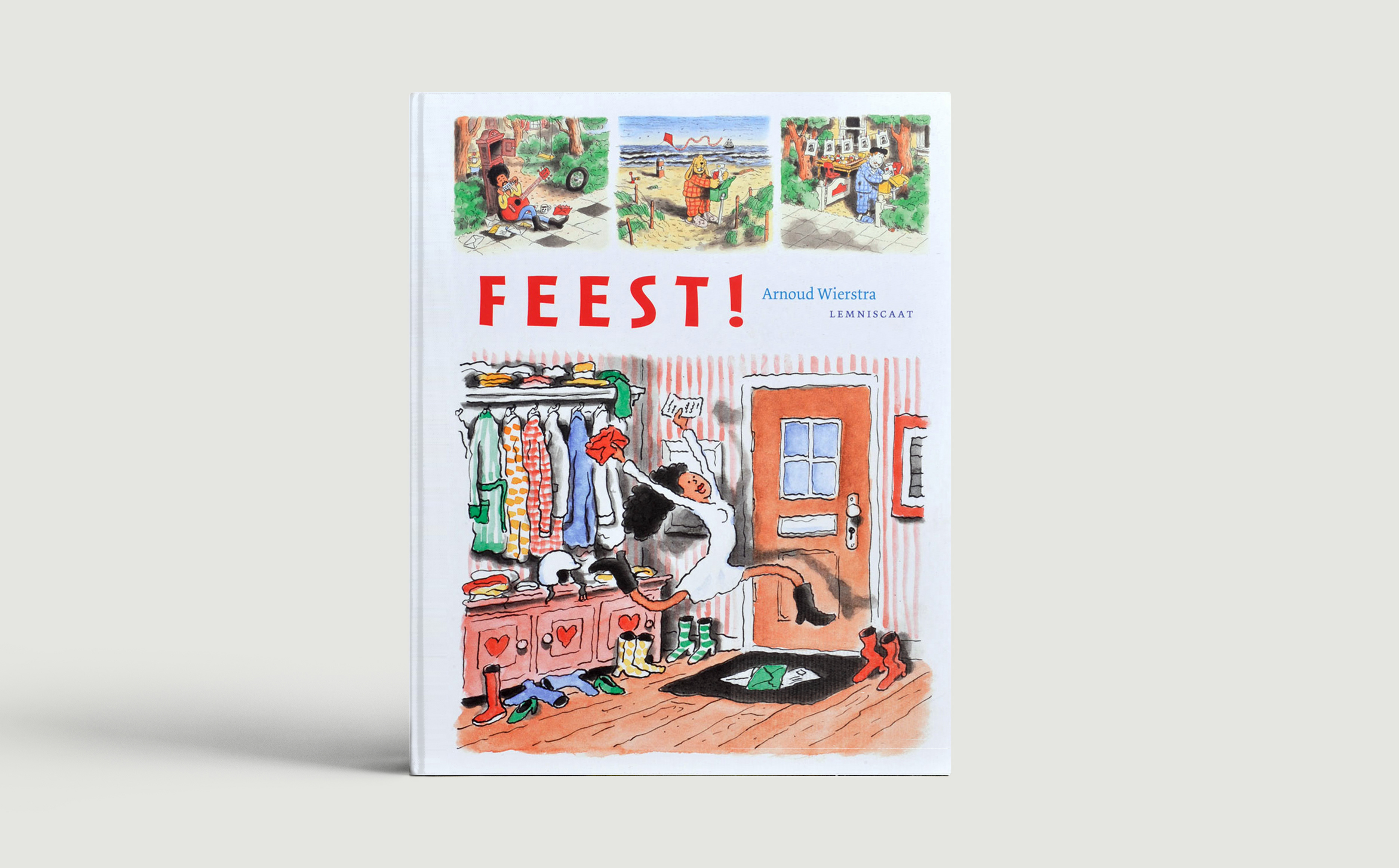 Ongetwijfeld het aardigste pas verschenen prentenboek is Feest! van nieuwkomer Arnoud Wierstra. In dit verhaal zonder woorden zien we hoe twaalf mensen en een konijn 's morgens opstaan. Ze hebben allemaal dezelfde uitnodiging naast hun bed liggen. Maar voor het feest kan beginnen moeten er nog cadeau's worden gekocht en ingepakt en overkomt sommige gasten bijna een ongeluk. De kracht van dit boek zit in het verhaal en de vorm die Wierstra heeft gekozen. Ieder personage heeft zijn eigen vakje, zoals in een strip, maar soms ontmoeten ze elkaar en dan delen ze samen een groter vak. Het spel dat de illustrator daarmee speelt gaandeweg steeds ingewikkelder en dat houdt het boek humoristisch en interessant. De tekenstijl van Wierstra, in het dagelijks leven psycholoog, is eigenzinnig en veelbelovend. Hij kan echter wel iets meer diepgang gebruiken. Feest! oogt iets te gemakkelijk bij elkaar gestift en geverfd. De hier en daar wat surrealistische illustraties en kunstwerken op zijn website laten zien dat hij meer in huis heeft en nog wel voor een verrassing kan gaan zorgen.